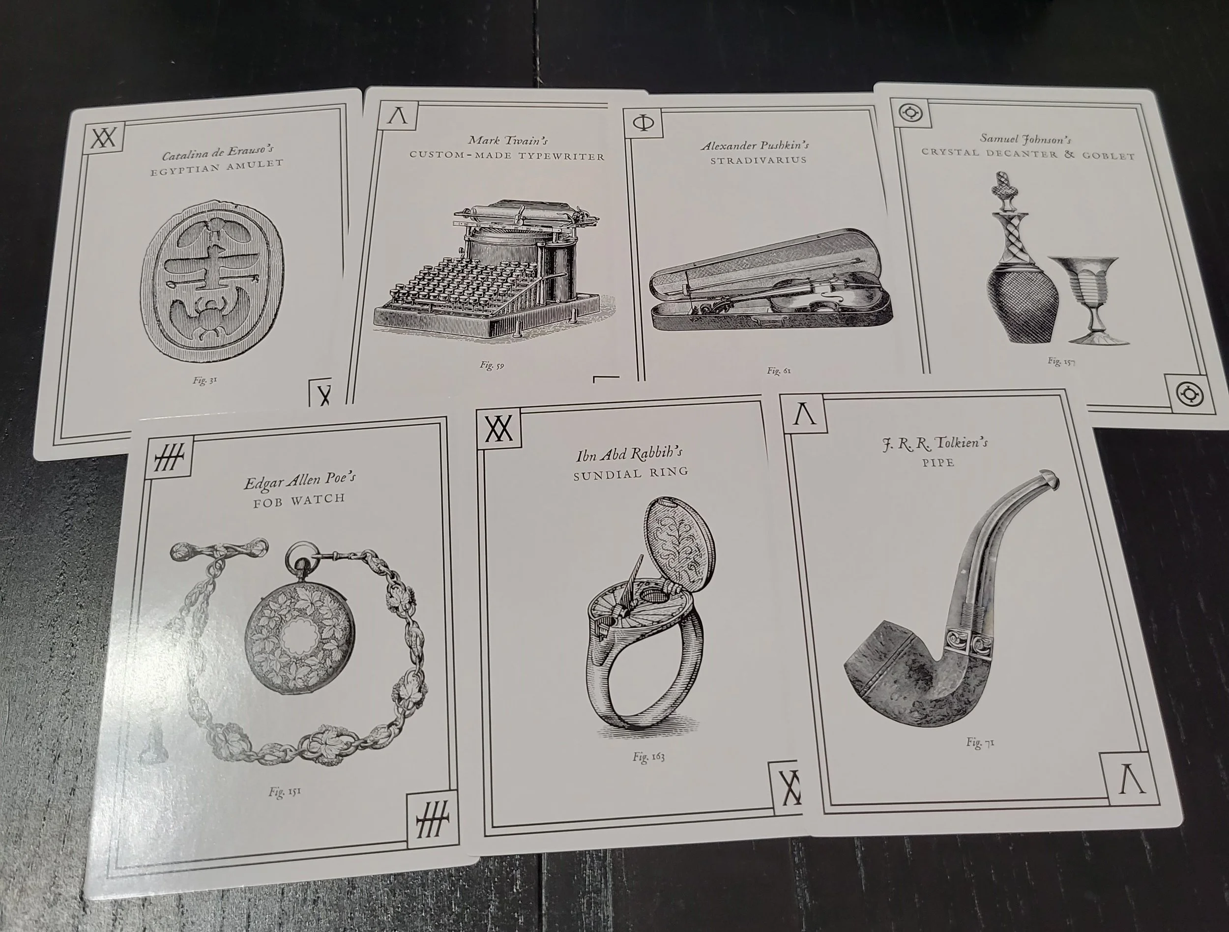 If you get it right, you get an artefact card. If you get it wrong, you get nothing. You play until you have enough artefacts to match all the symbols on your character card. Here is a sampling of the artefact cards.
